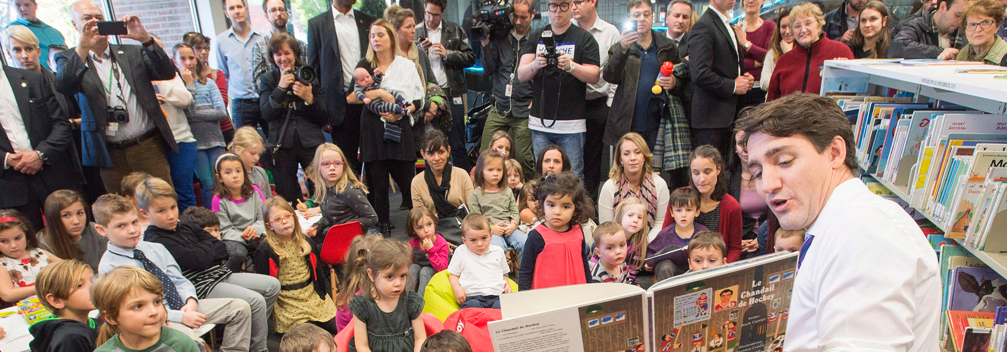 Photo: Prime Minister Justin Trudeau reads Roch Carrier’s book The Hockey Sweater at a library before announcing changes to the Canada Child Benefit on October 27, 2017 in Saint Bruno-de-Montarville, Que. THE CANADIAN PRESS/Ryan Remiorz