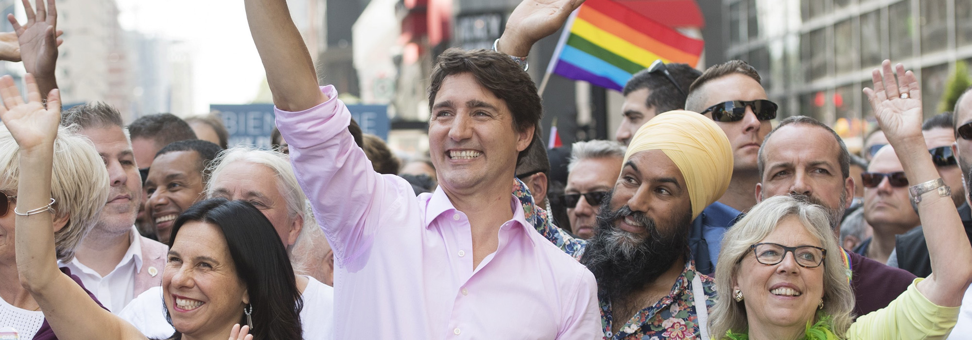 Photo: Le premier ministre Justin Trudeau (deuxième à g.) assiste à Montréal au défilé de la fierté gay en compagnie de la mairesse Valérie Plante (à g.), du chef du NPD Jagmeet Singh et de la chef du Parti vert Elizabeth May (à d.), le 18 août 2019. La Presse canadienne/Graham Hughes