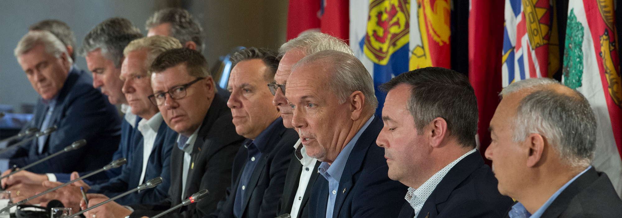 Photo : Les premiers ministres canadiens (de gauche à droite) Sandy Silver (Yukon), Dwight Ball (Terre-Neuve-et-Labrador), Brian Pallister (Manitoba), Stephen McNeil (Nouvelle-Écosse), Doug Ford (Ontario), Scott Moe (Saskatchewan), François Legault (Québec), Blaine Higgs (Nouveau-Brunswick), John Horgan (Colombie-Britannique), Jason Kenney (Alberta) et Joe Savikataaq (Nunavut) à la conférence de presse de clôture après la rencontre des premiers ministres à Saskatoon, le 11 juillet 2019. La Presse canadienne / Jonathan Hayward.