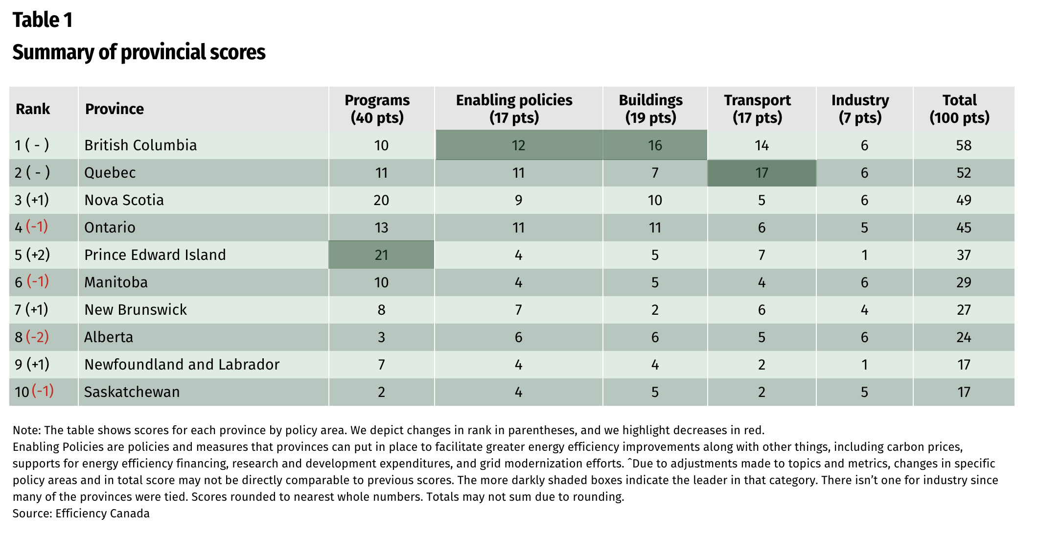 British Columbia again earned the top rank, with 58 points out of 100 (table 2). The province pioneered the development of a building code that not only defines a minimum standard for energy efficiency, but also outlines higher performance steps that advanced municipalities are adopting. This policy leads the province towards net-zero energy-ready buildings. The upcoming national model building codes for 2020 are also designed this way so other provinces can make energy efficient new buildings the norm by learning from the BC example.