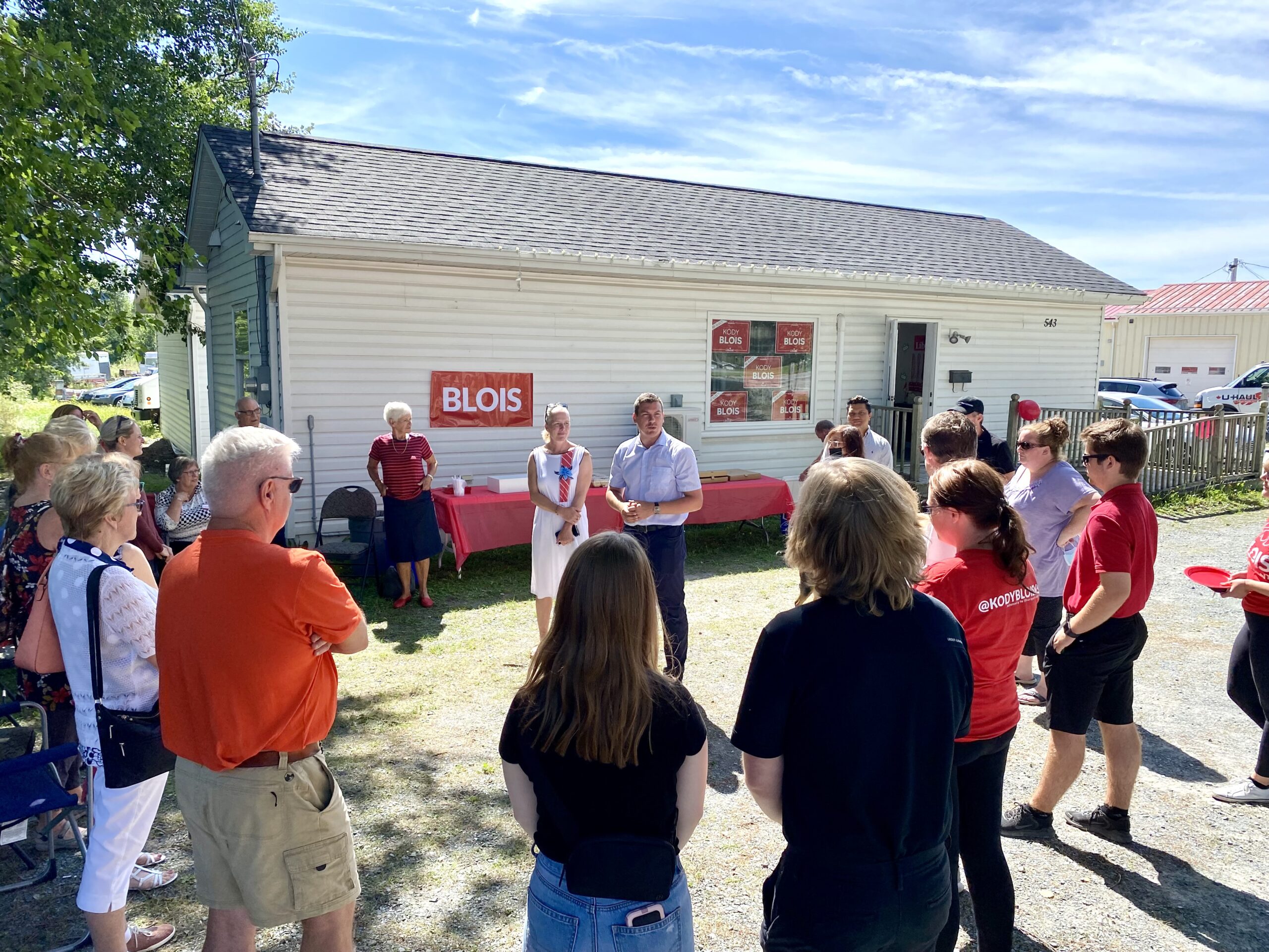 Kody Blois speaking to supporters with then-MP Catherine McKenna at the opening of Blois’s headquarters in Elmsdale, N.S. this past August. Source: Kody Blois’s campaign team.