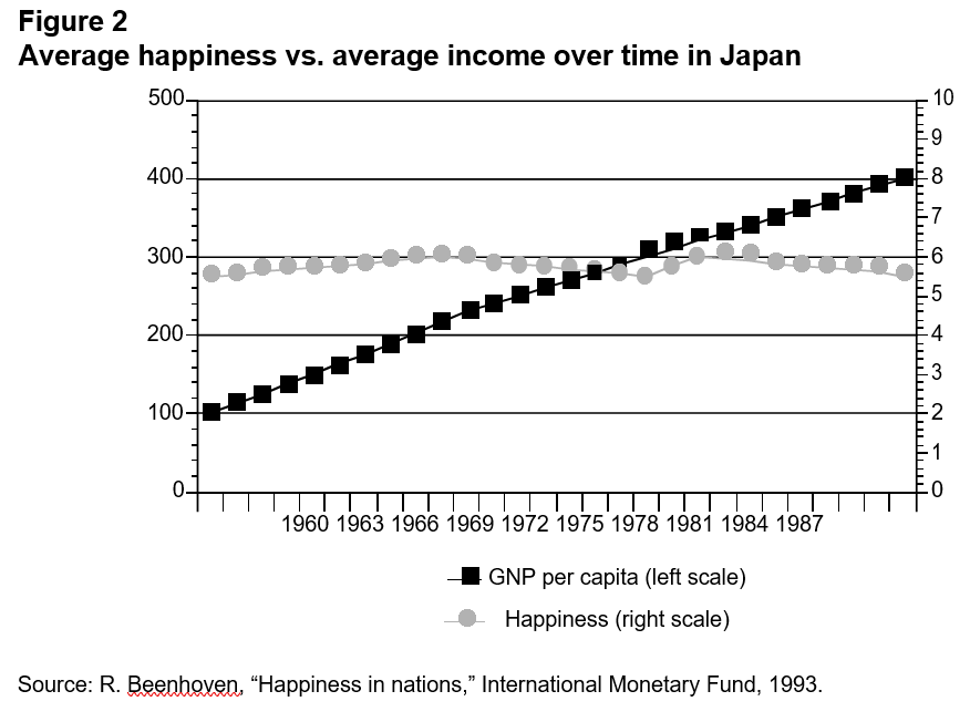 A large body of data from the behavioural science literature links human well-being to relative income. Michael Wolfson mentioned the research linking inequality and health, and there are also studies linking inequality and broader measures of well-being. Behavioral scientists have developed a number of different ways to measure human well-being, and these measures have been used in a large body of research that probes the links between income, wealth and well-being. One basic finding is that once a country passes a relatively low threshold of absolute income, across-the-board increases in income and wealth do not produce measurable increases in happiness. The chart for Japan in Figure 2 below is representative of findings of this type. Income goes up steadily over time, yet the happiness measures just bump along at roughly the same level year after year.