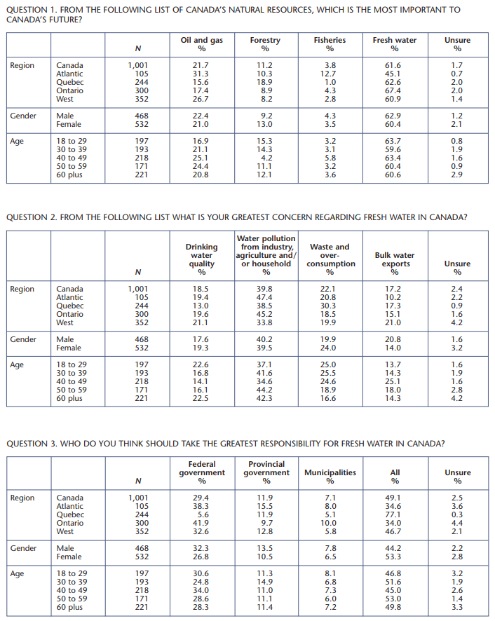 JIM PRENTICE: Well, those results actually do not surprise me, because I’ve long felt and said that Canadians are quite passionate about the environment and the outdoors in a very real way. What that relates to is our lakes and rivers and streams, and the ocean as well. So it doesn’t surprise me that Canadians have given it that degree of importance. People understand that in the modern environmental context, all of our rivers and water streams are connected, and so it is not surprising that people, being shrewd as they are, would see that it requires federal jurisdiction, and the very minimum, as a concurrent jurisdiction. And so we certainly see the same thing in other polling that I’ve ever seen relative to the environment. And what Canadians expect from the government right now is that our environmental policies include, in addition to climate change, policies that have tangible effects on water and the quality of the water around us.