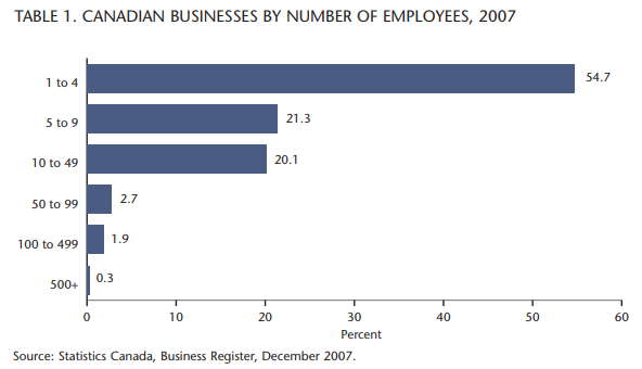 SMEs are an integral part of the industrial fabric of Canada. Of the approximately 1.1 million employer businesses that exist in our country, 97.8 percent are small enterprises (fewer than 100 employees), 1.9 percent are medium-sized enterprises (100 to 499 employees), and the remaining 0.3 percent are large enterprises (500 or more employees; see table 1).