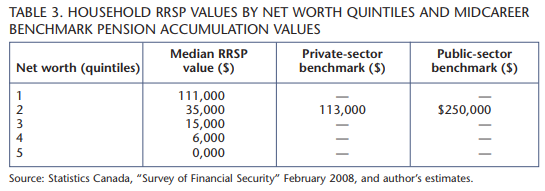 The distribution of RRSP savings plotted against the total net-worth (i.e., a measure of wealth) rankings of Canadian households offers a clue as to how this question might be answered. As table 3 indicates, this distribution is asymmetrical, and the top 20 percent of Canadian households ranked by their net worth have a median RRSP value of $111,000. The median values by quintile for the other 80 percent of Canadians ranked by net worth are considerably lower at $35,000, $15,000, $6,000 and $0. Arguably, the $35,000 median RRSP value of the group with the second-highest net worth (i.e., in the second quintile) offers a not unreasonable basis of comparison against two possible adequacy benchmarks: the mid-career RRSP value of a private sector worker who has contributed a modest 7 percent of a constant $60,000 salary each year; and the midcareer fair value of the accrued pension of a public sector employee earning a constant $60,000 per year.