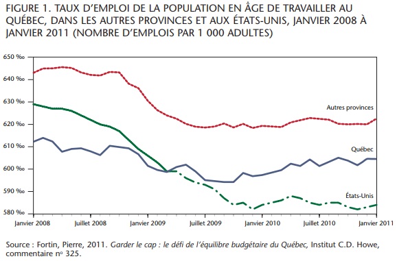 La première est que la récession de 2008-2009 est la moins profonde de l’histoire moderne au Québec, qu’elle a frappé moins fort la province que le reste de l’Amérique du Nord et l’Europe, et que la reprise y est maintenant bien amorcée. L’appui de l’État à une économie en détresse conjoncturelle est tout à fait indiqué, mais il n’y a pas de détresse présente ou appréhendée au Québec.