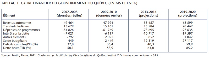 En mars 2009, la ministre des Finances du Québec, Monique Jérôme-Forget, a présenté son dernier budget. Ce document révélait qu’à moins d’un sérieux coup de barre aux revenus et aux dépenses, le gouvernement du Québec s’acheminait vers un déficit budgétaire de 10 milliards de dollars en 2013-2014. Un an plus tard, en mars 2010, le budget 2010-2011 de son successeur, Raymond Bachand, a confirmé ce diagnostic en l’amplifiant. Il calculait que, si on laissait les choses aller, le déficit dépasserait 12 milliards de dollars en 2013-2014. La mise à jour économique et financière de décembre 2010 a confirmé cette projection.