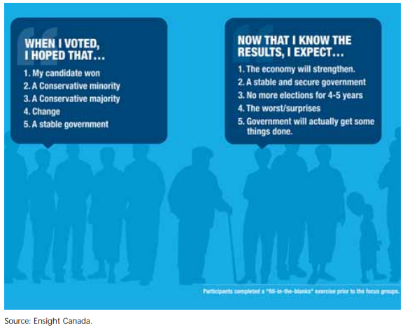 The Liberals were pounded, in part, because they failed to provide a compelling message beyond fingerpointing. Voters did not believe the election was necessary, they did not accept the Liberals’ case on ethics and they craved being freed from the endless brinksmanship of minority parliament. Indeed, minority fatigue was something we heard about again and again in all parts of the country. Unlike 2006 and 2008 when most voters in our research on those elections were comfortable with what we called “government on a short leash,” Canadians this time made it clear that they understand the stability and duration of a majority was necessary to deliver on the changes they expect from their government. Harper gambled in his bid for a clear victory, and this research reveals he read many Canadians right.