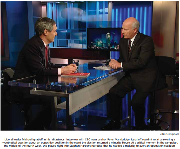 After the first few days of the campaign, Harper reduced the references to the coalition in his speeches and began selling the budget. The coalition question subsided as a top-of-mind issue, but then in mid-campaign, Ignatieff had a disastrous interview with a relentless Peter Mansbridge, who pressed him on his post-election scenarios in the event of a Conservative minority.