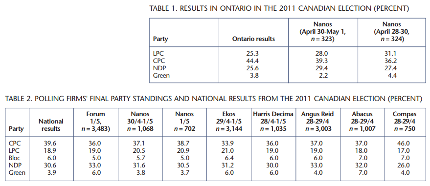 This article will make three arguments. First, the polling commissioned by the media is superficial. It failed to contribute to democratic debate, and it did not provide an understanding of why Canadians were voting as they did. Second, even within the limited objectives of campaign polling, the research conducted was not terribly successful. Third, the research industry would benefit by being more transparent about the methodologies used to arrive at the numbers. Discrepancies between polls created a lack of confidence in the industry as a whole. Yet these discrepancies are often the result of different methodologies, in particular, different questions used to assess vote intention, different placement of the question and differences in the populations reported on. Being more forthright about these methodological choices would help maintain confidence in the discipline.