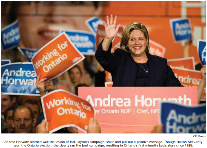 To begin with, Redford underwent a substantial personal makeover. She changed her hair and her wardrobe to look more feminine, and a winning smile replaced the famous Redford stare. Her campaign photo made her look like a warm, attractive mother, not a feminist human-rights lawyer. As the leadership campaign progressed, she distinguished herself from the crowded field of six by being the most willing to criticize policies adopted by Stelmach’s government. She convinced the media that she stood for “change,” even though she had been Stelmach’s minister of justice and had publicly supported all the policies she now criticized. This was stagecraft of a high order.