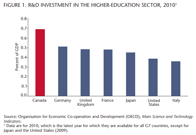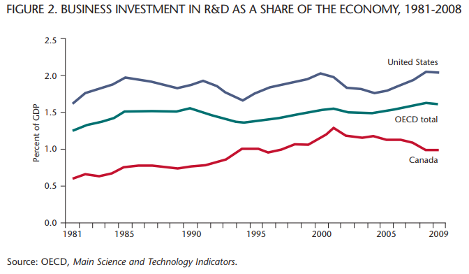 Report upon report has focused on the historical overreliance upon the (then) low Canadian dollar, the resource economy and the lack of sufficient access to capital and the risk-averse business culture of Canada’s private sector. The prevailing logic is to blame industry for the lack of receptor capacity for the ideas and inventions being generated by fundamental discovery-based research. (Federal basic research programs were specifically outside the mandate of the Jenkins Panel.) The confounding question is whether there are public policy levers available to government to adequately enable improved business R&D performance, to spur innovation in Canada. Given the over $5 billion per year of federal support to business innovation through a range of direct support programs and through a 35-year-old tax credit incentive, this question is not inconsequential. In a time of government fiscal restraint, this question becomes all the more urgent.