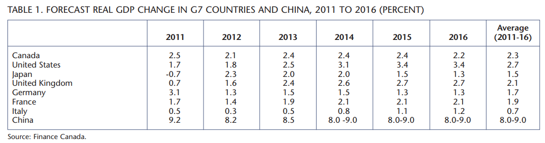Canada is forecast to do relatively well, and the neighbourhood even better, compared to the G7 average. The challenge is that the 2.3 percent average pace of Canadian growth forecast over the 2011 to 2016 period is low relative to what it was in previous postwar cycles, reflecting slow productivity and labour force growth, and continuing softness in our major export markets, which are predominantly G7 countries.