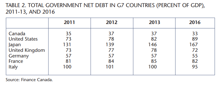 In today’s volatile and uncertain international environment, how should we feel about Canada’s fiscal credibility, which was gradually lost over the 1980s and early 1990s and re-earned by dramatic, tough and long-lasting fiscal actions in the mid-1990s? As stands out in table 2, in 2012 Canada has the lowest total government net debt as a percentage of GDP among the G7 countries, less than half that of that of the United States and well below that of Germany, which is the second-best fiscal performer in the G7. Canada’s Budget 2012, with its substantial fiscal restraint measures, should only reinforce the confidence in markets that the government will achieve its previously stated objective of returning to fiscal balance in 2015/16. Considering current fiscal plans across the G7 countries, which have varying degrees of uncertainty, particularly in the United States, Canada will have the strongest total government fiscal position by far in 2016.
