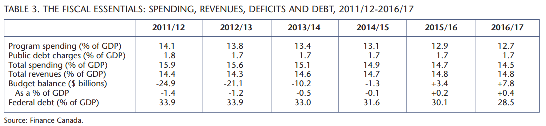The 2012 budget takes aim at medium-term fiscal stability with a series of spending reduction measures totalling about $5 billion, or 0.2 percent of GDP when fully implemented. There are also several revenue enhancement measures that add up to $1 billion over the same period. The result, as the fiscal essentials set out in table 3 indicate, is a credible fiscal plan to balance the books by 2015/16 at the latest, and likely earlier given the degree of prudence built into the fiscal framework. The federal deficit this fiscal year is estimated at $21.1 billion, or 1.2 percent of GDP, falling to a deficit of $10 billion next year. This will allow the federal government to have a declining federal net debt-to-GDP ratio starting next year, a declining total government-spending-to-GDP ratio throughout the fiscal plan and stable total revenues-to-GDP ratio.