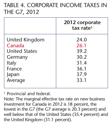 The budget’s response was targeted in six areas: (1) leadership and renewed support for innovation, with an explicit recognition that it is the private sector that must be more innovative; (2) trade enhancement through new trade negotiations and a promised overhaul of the trade commerce strategy; (3) more efficient regulatory processes for natural resource developments; (4) more efficient processes for immigration; (5) reaffirmation of the importance of foreign investment and implicit acknowledgement that it is less the ownership of capital than the behaviour of capital in Canada that will drive benefits for Canadians that matters; and (6) confirmation of the size of the G7 corporate income tax advantage (see table 4) that Canada has created over the last decade, especially in relation to the United States.