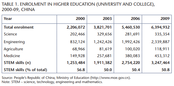 In the case of China, university enrolment has been rising at a staggering rate since the 1990s, particularly over the past decade. Between 2000 and 2010, graduate student enrolment alone grew from 283,000 to 1.5 million, while total enrolment in higher education reached 22.3 million by the same year.
