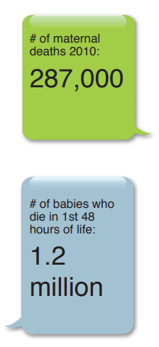 Giving birth should be a time of joy but for too many women around the world it leads to death or serious illness for the mother or baby, or both. While United Nations and World Bank studies show maternal deaths have dropped by nearly half over the last 20 years, the 287,000 deaths in childbirth in 2010 were still well below the Millennium Development Goal of cutting the number by three-quarters from the 1990 benchmark by 2015. There are also more than a million stillbirths every year, and another million babies die for lack of quality health care within their first 48 hours.