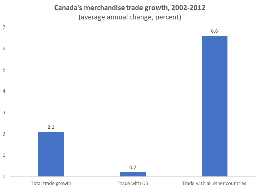 Driver 1: Canadian trade has stagnated with US, but grew with rest of world over the past decade.