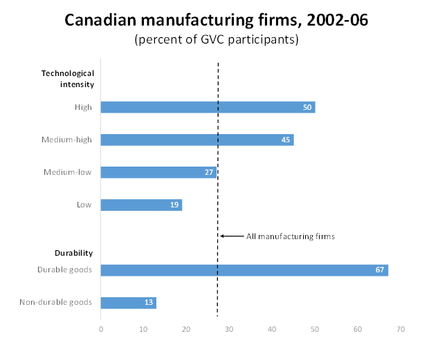 Despite their small population share, GVC firms were responsible for most of the value of international trade in Canada’s manufacturing sector: 90% of all intermediate imports and 83% of exports (the rest came from those who only imported or only exported).
