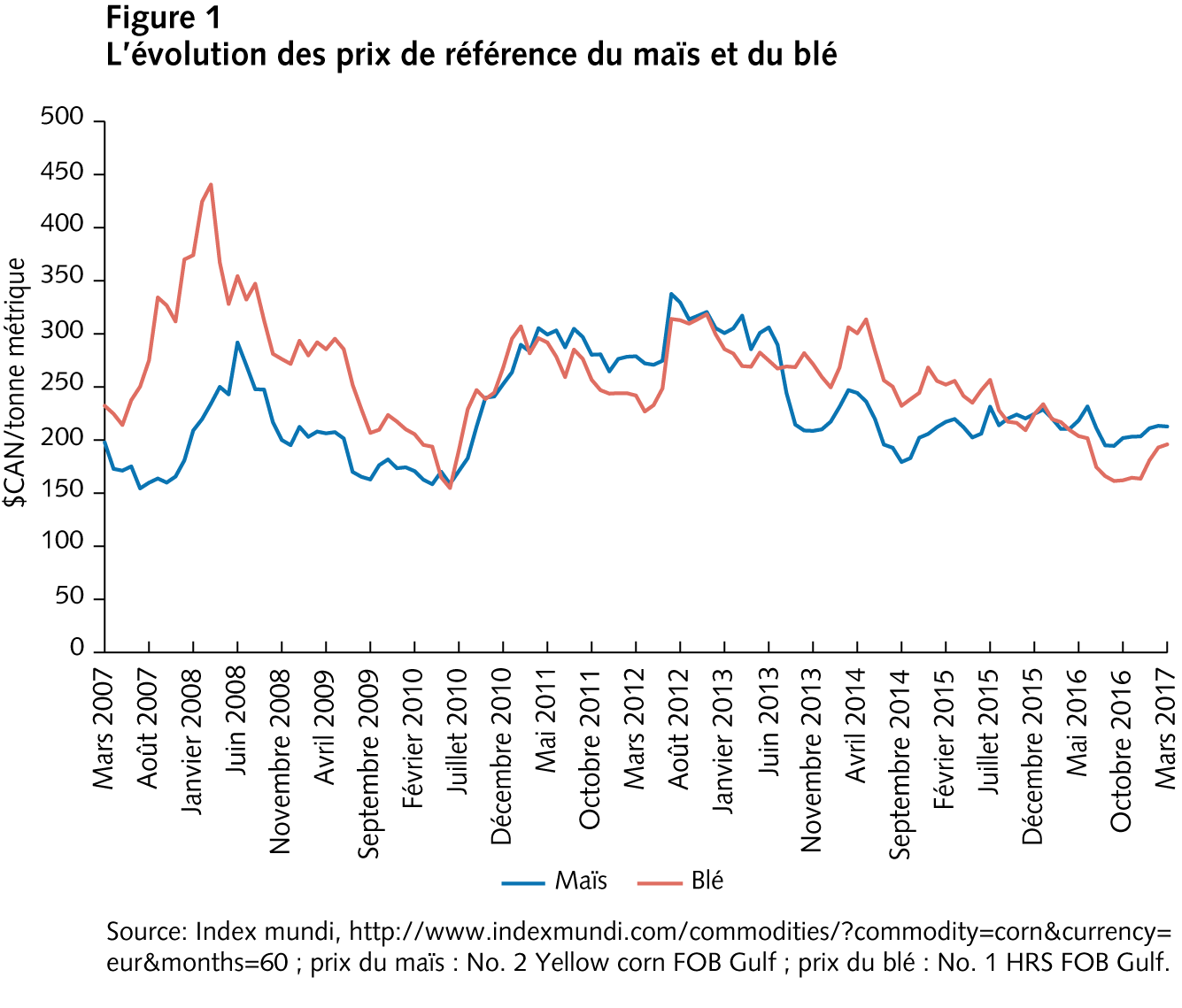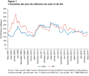 Après les envolées des prix des céréales de 2008 et de 2011, les cours mondiaux sont revenus à des niveaux plus bas. Comme l’illustre la figure 1, il y a eu une correction du prix du maïs en 2013, et le prix n’a pas beaucoup varié depuis ; dans le cas du blé, on observe une lente tendance à la baisse depuis 2012. Comme les prix élevés des céréales, de 2008 à 2012, ont contribué à l’augmentation rapide du prix des terres agricoles partout au pays, puisqu’il est maintenant plus clair qu’ils se sont stabilisés, la valeur des terres agricoles devrait augmenter beaucoup moins rapidement au cours des prochaines années, et ce, même si les taux d’intérêt demeurent bas.