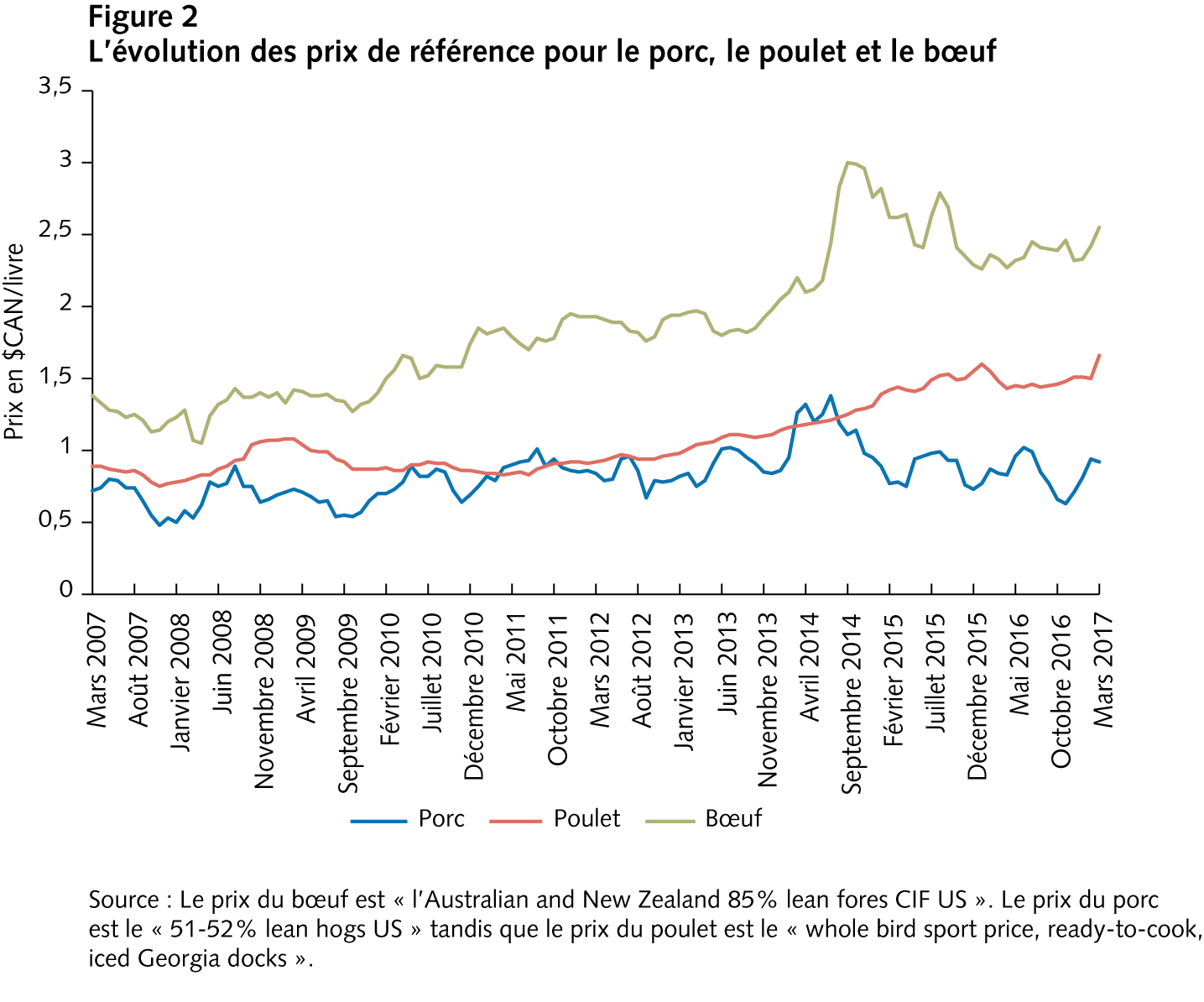 Pour les viandes, les deux dernières années ont été plus difficiles pour les éleveurs de porcs et de bovins comme le montrent les tendances baissières que l’on observe à la figure 2. Par contre, le prix de référence du poulet a été plus stable. L’embargo russe décrété en réponse aux sanctions imposées par l’Union européenne, les États-Unis, le Canada, l’Australie et la Norvège a engendré une segmentation de marchés importante, la liste russe d’interdictions d’importations s’allongeant pour inclure la Turquie, l’Islande, l’Albanie, le Monténégro, le Liechtenstein et l’Ukraine. Notons que, en ce qui a trait au Canada, la Russie était devenue l’un de ses plus grands acheteurs de porc congelé. La Russie a eu de la difficulté à trouver de nouvelles sources d’approvisionnement, et les prix des aliments et des boissons non alcoolisées ont augmenté de 27 % entre août 2014 et août 2016 (pour des statistiques plus détaillées, voir ce site) ; malgré cela, rien n’indique que l’embargo pourrait être levé à court terme. Les transformateurs de porc canadiens se sont bien adaptés à la situation, grâce à un dollar canadien relativement faible par rapport au dollar américain et en raison d’un problème de diarrhée épidémique porcine aux États-Unis. La révocation en décembre 2015 de la loi américaine sur l’étiquetage obligatoire par pays d’origine pour la viande fraîche de porc, de bœuf et d’agneau devrait solidifier l’intégration du marché nord-américain au bénéfice des producteurs canadiens, ceteris paribus.