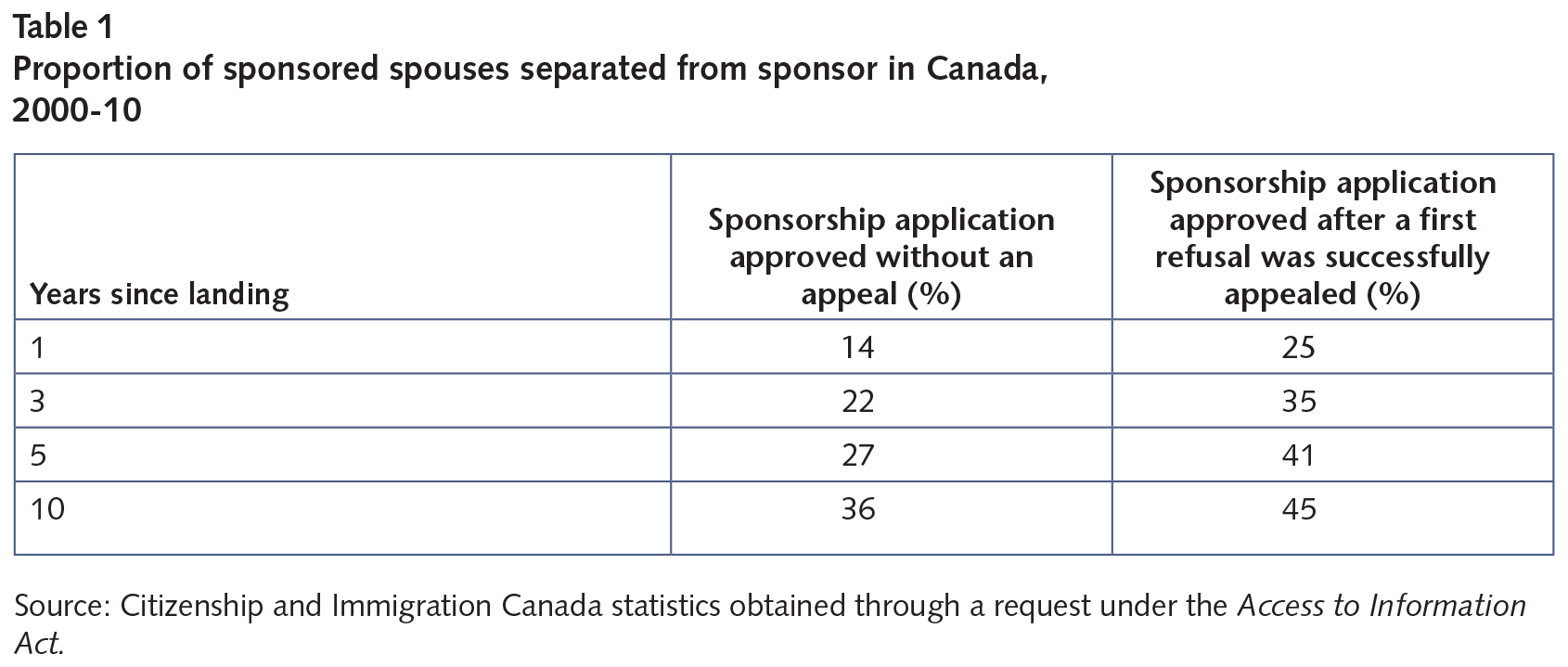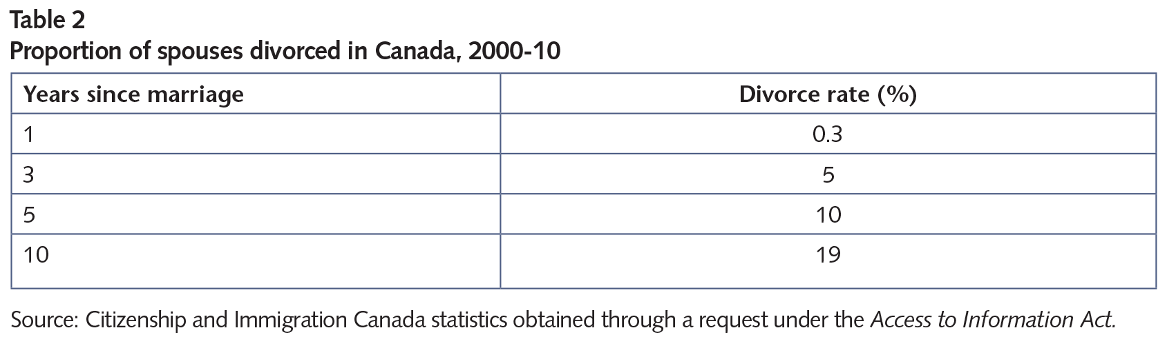 When the Conservatives introduced conditional permanent residency in 2012, their objective was to combat marriages of convenience. According to a regulatory impact analysis statement published in 2012, Canada’s immigration department processed approximately 46,300 applications in 2010 from people who wished to immigrate because they were the spouse or common-law partner of a Canadian. About 16 percent of these were refused, mostly because immigration officials determined that the marriages were not genuine and were instead entered into primarily for immigration purposes. As shown in tables 1 and 2, the separation rate for recently sponsored immigrants was much higher than the overall Canadian divorce rate during the years following a marriage.