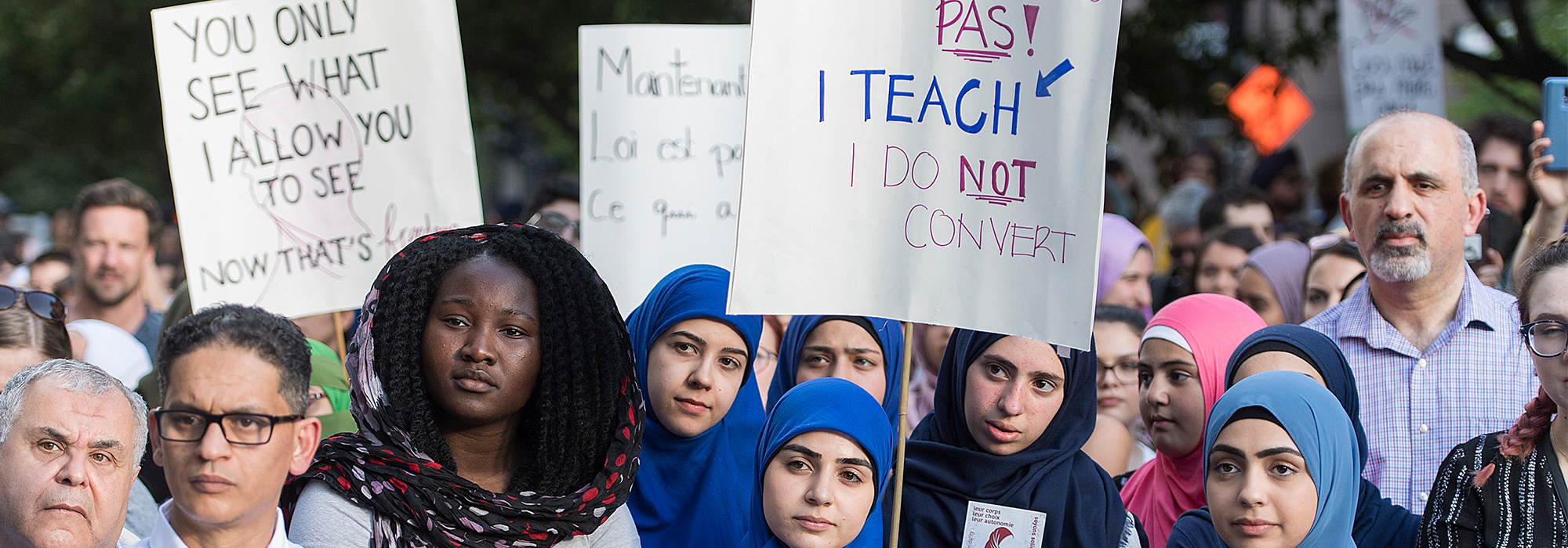Photo: Manifestation contre la loi sur la laïcité du gouvernement du Québec. Montréal, le 17 juin 2019. La Presse canadienne / Graham Hughes