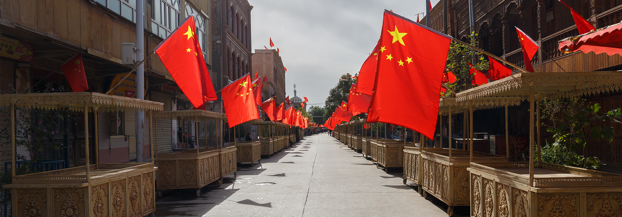 Photo: Chinese flags fly over market stalls in Kashgar, Xinjiang, Western China, marking a Chinese national holiday in September 2017. Shutterstock/By Chris Redan