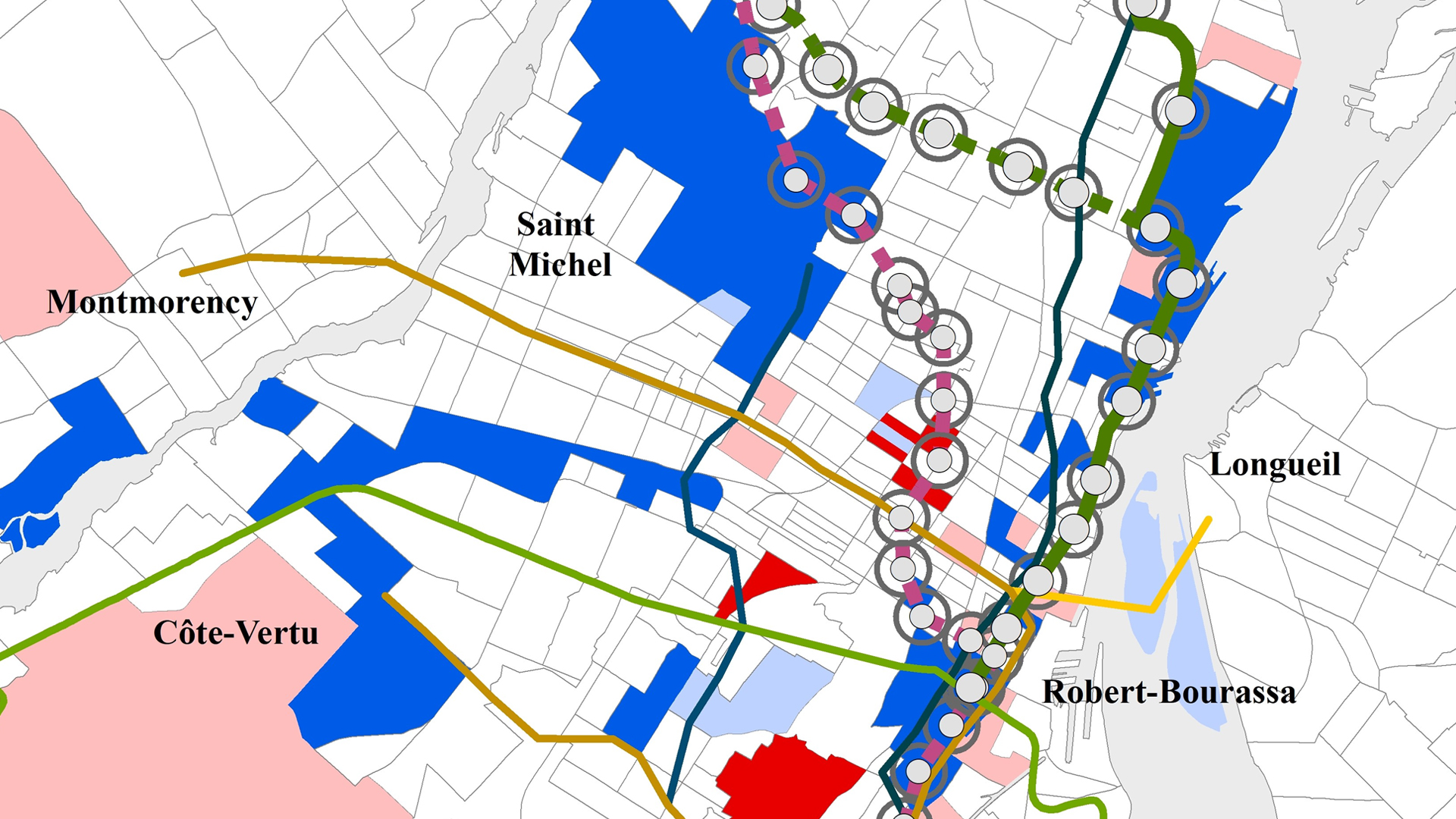 On voit bien sur le plan le parallèle étroit entre le développement du REM de l’Est et la ligne de métro verte actuelle dans le corridor Ville-Marie–Mercier-Hochelaga–Maisonneuve. À première vue, il est également évident que plusieurs des arrêts proposés le long du tronçon REM de l’Est allant vers le nord (au CÉGEP Marie-Victorin, en passant sous le boulevard Lacordaire) ne sont pas situés dans les quartiers à plus faibles revenus, pas plus que les six stations plus à l’est, dans le secteur de Pointe-aux-Trembles. En revanche, plusieurs des stations de la ligne rose qui s’étendraient dans Saint-Michel, Villeray, Parc-Extension et Montréal-Nord chevauchent les grappes de quartiers à plus faibles revenus.